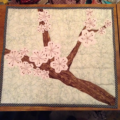 As I am sure you can imagine, this was not the quickest mini I have ever done LOL! Then I added another layer of wool batting, machine appliqued my branches on, hand appliqued three different sizes of cherry blossoms and hand embroidered the stamens.